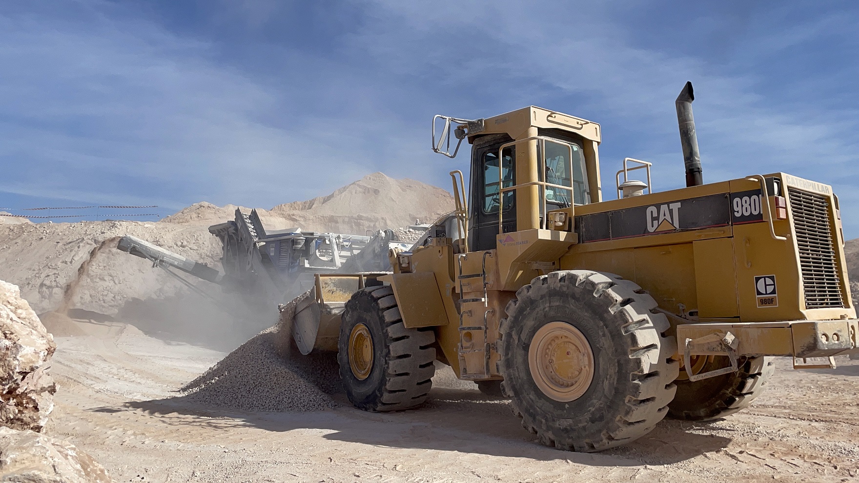 Fabricación de zahorras mediante equipo de trituración formado por un molino Kleemann MR130ZS, una giratoria Komatsu HB365LC-3 híbrida y una pala cargadora CAT980F en el parque eólico de Gecama para el Grupo Isidoro Empresarial.